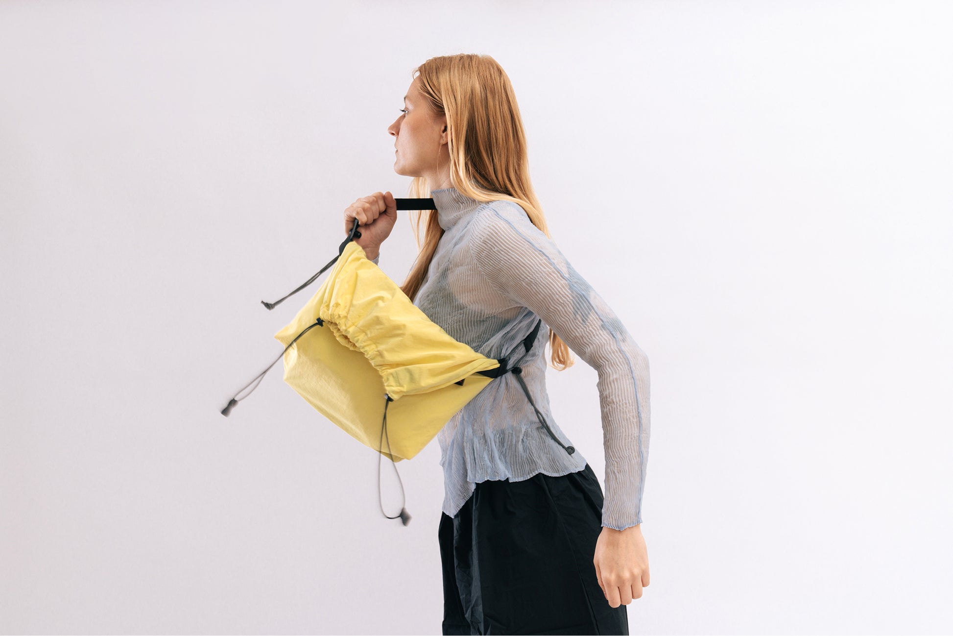- M112//DRAW.LARGE.POUCH - chalk yellow Materials: Waterproof recycled polyester Italian fabric, reinforced with recycled polyester webbing made in The Netherlands. Elastic drawstring closure and inner zip pocket. Detailed with 'PACK' and 'Made in Europe' woven label. Measurements, folded: 37cm x 27cm x 7cm. Fits 13" laptop. Made in: Amsterdam, The Netherlands