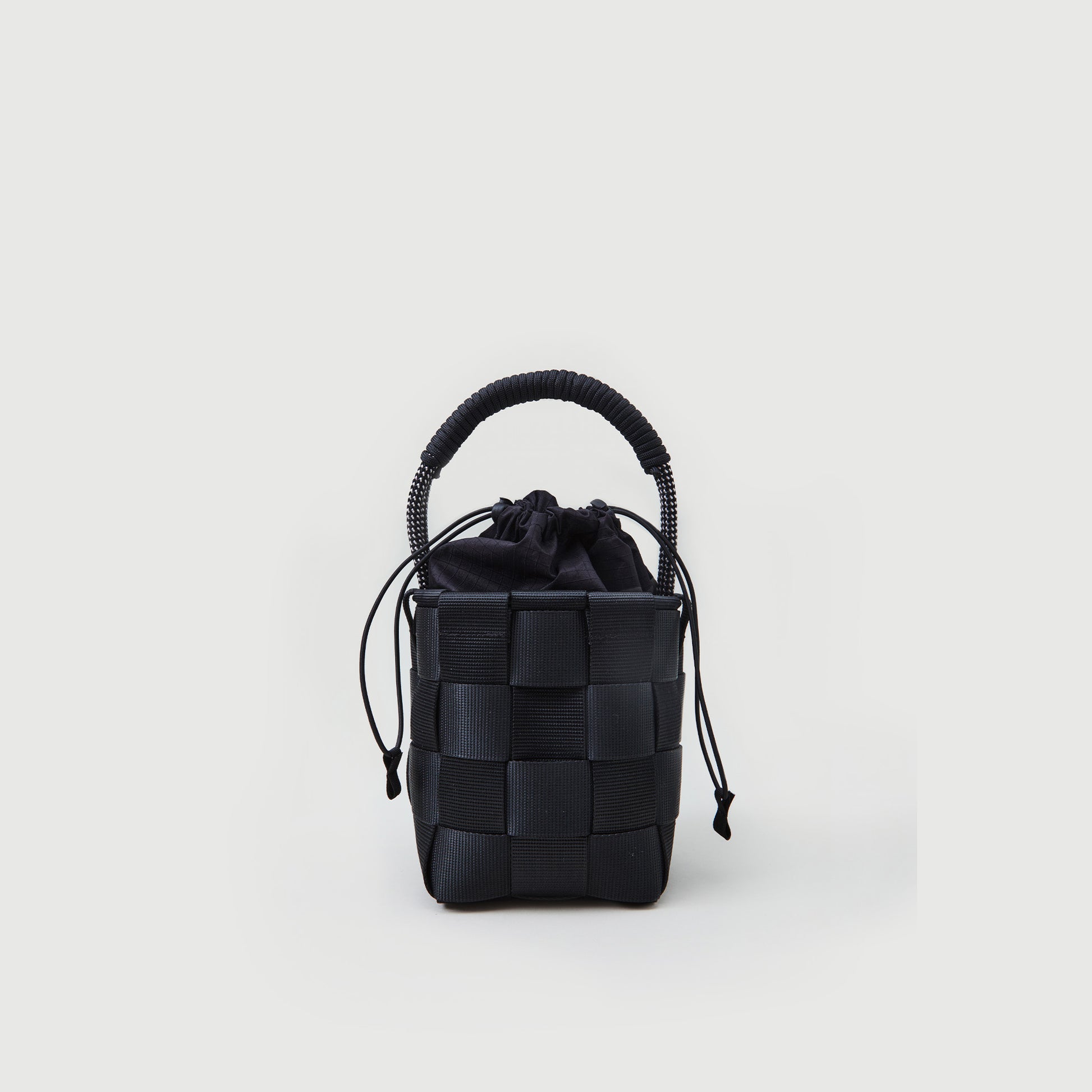 - M702//WIDE WEB.SMALL.SQUARE BASKET - lead black Materials: recycled polyester webbing, made in UK. Measurements: 12 x 16 x 12 cm Made in: Amsterdam, The Netherlands