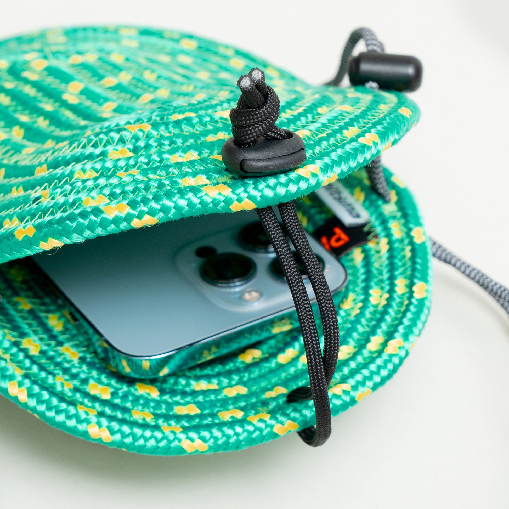 - M751//REIN REITSMA.PHONE.COIL BASKET - green Materials: polyester rope, with paracord + ykk cord stopper closure. woven labels on the inside. Measurements: 14,5 x 22cm Made in: Rotterdam, The Netherlands