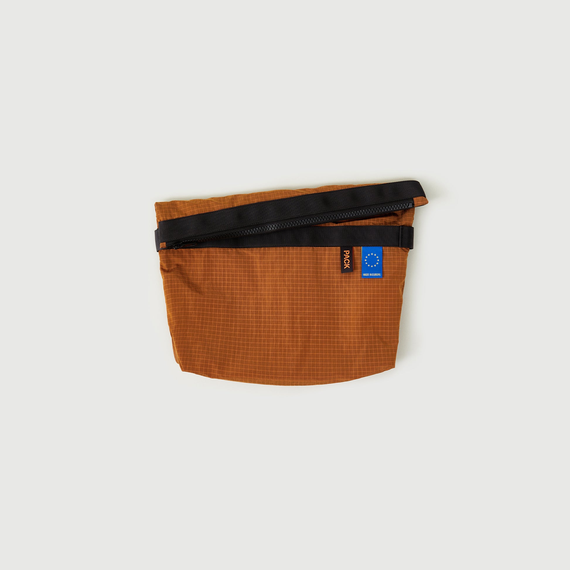 Materials: Waterproof ripstop polyester from Italy, reinforced with recycled polyester webbing made in The Netherlands. YKK vislon zipper closure and YKK zipper at inner pocket. Detailed with 'PACK' and 'Made in Europe' woven label.