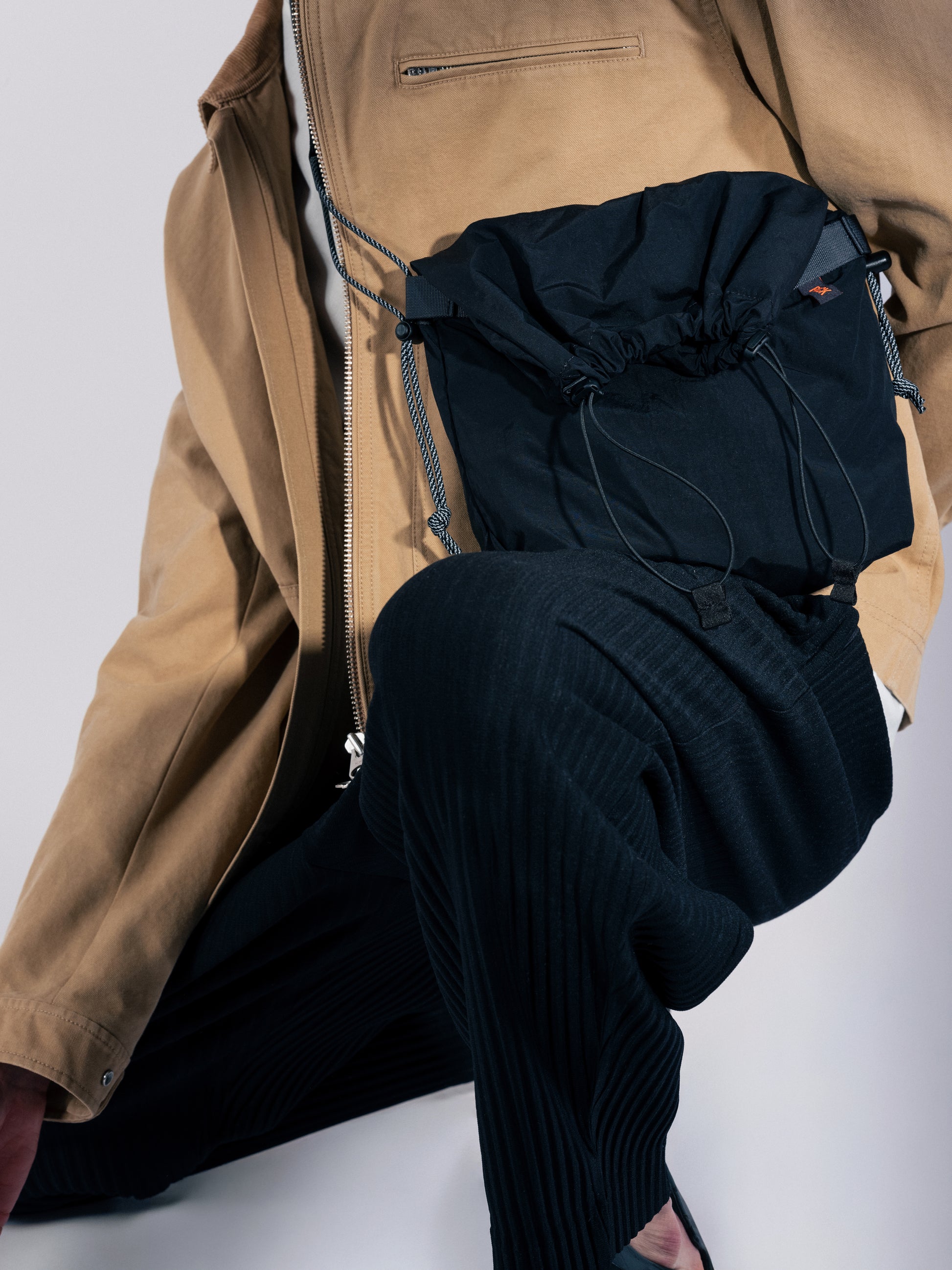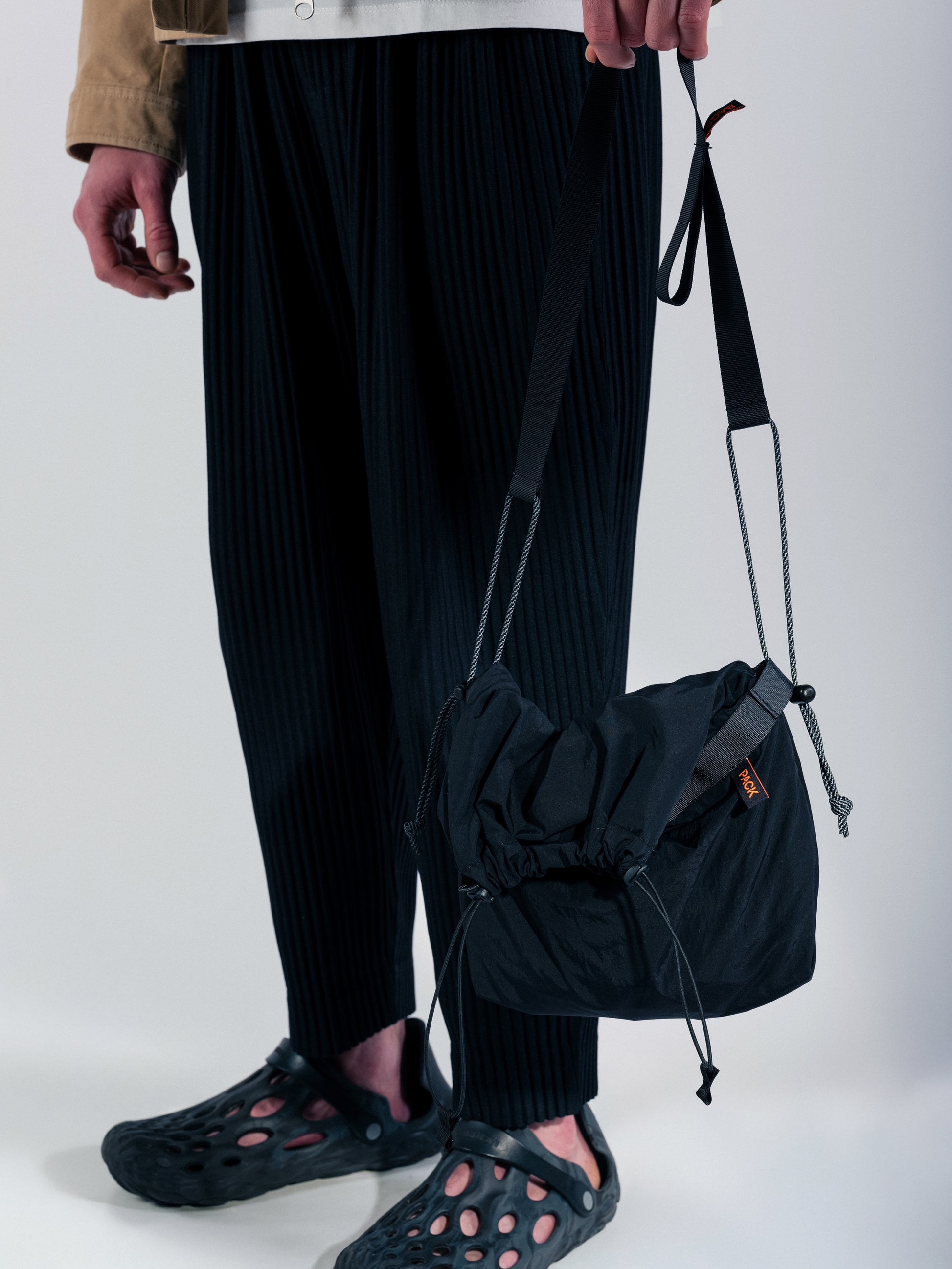 Attach this strap by taking the knot and cordstoppers out, feeding the cord through the side loops of your fold pouch, and re-do the knot.